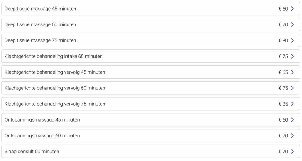 Via onderstaande links kun je nagaan of jouw zorgverzekeraar een gedeeltelijke vergoeding biedt voor alternatieve zorg met prestatiecode 90-24017 Massagetherapie of 90-24013 Neuromusculaire therapie, waar de klachtgerichte behandelingen onder vallen.